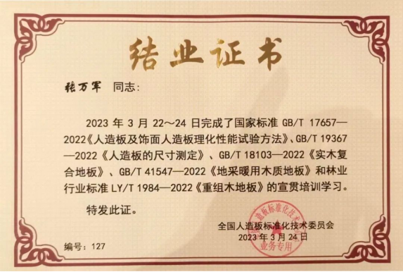 人造板标准宣贯培训会上,对5项新颁人造板试验方法与木地板标准进行权威解读,并邀请行业权威专家报告产业发展动向。天湘板业张万军同志作为代表参加了本次培训,获得结业证书。