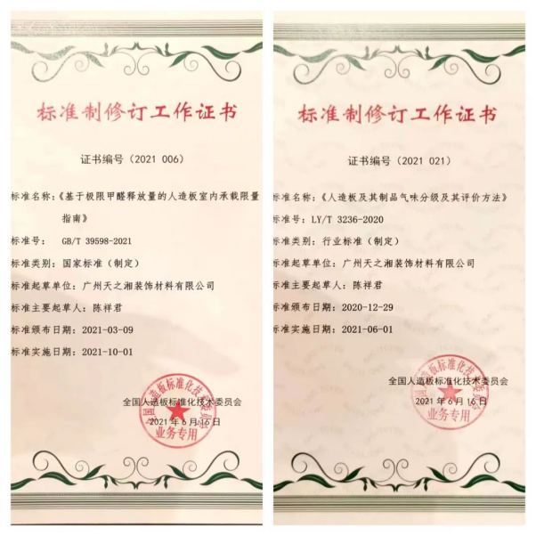 天湘板业,始源于1986年,参与过多项行业内标准起草,技术实力雄厚,作为全国人造板标准化技术委员会成员之一,在行业发展中一直发挥重要的引领作用。本次标准研讨会亦在受邀之列,获得了《基于极限甲醛释放量的人造板室内承载限量指南》和《人造板及其制品气味分级及其评价方法》两项标准制修订工作证书,这是对天湘板材整体研发与制造水平的又一次肯定。