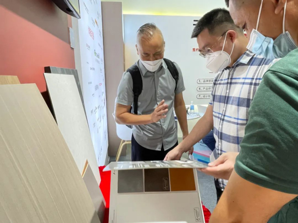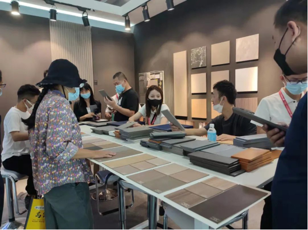 同频共振,聚享未来!2022广州建博会首日盛大开幕,天湘板业位于广交会展馆B馆负一层13.1-44(定制材料馆)黄金展位,吸引了众多宾客前来参观产品,体验天湘板材的舒适手感,洽谈业务,探讨行业趋势。