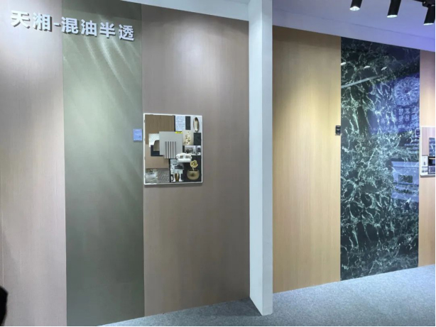 本次展会天湘以“家居·印象”为主题,集中展示电子烤漆、金砂极简、蕾丝SHOW、摩尔纹影木、仿生小牛皮,混油半透之外。还有神秘新品穿插其中,据天湘研发人员介绍,因其卓越的饰面效果,被客户强烈要求提前亮相,答案我们下次揭晓。