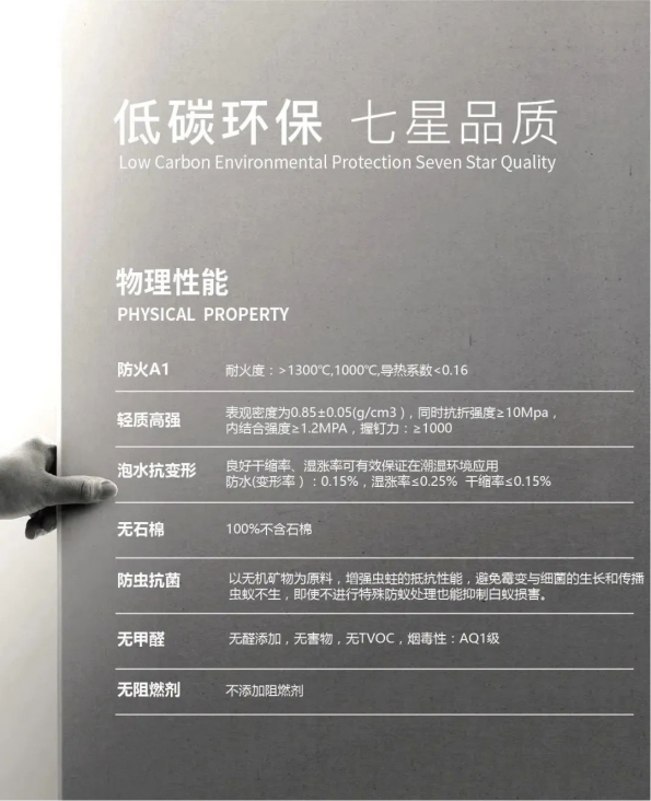响应国家双碳战略,攻克行业难点,“七星级”的无机板材原晶板应运而生——它以无机矿物尾矿和天然木浆纤维为主要材料,成品实现了A1级防火,轻质高强,泡水抗变形,无石棉,无甲醛,无烟毒性,防虫抗菌七大星级标准。