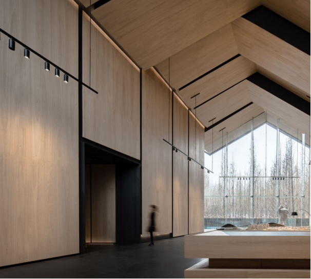 雄安完全中学项目报告厅采用定制尺寸原晶板铺就整个墙面天花魔幻造型