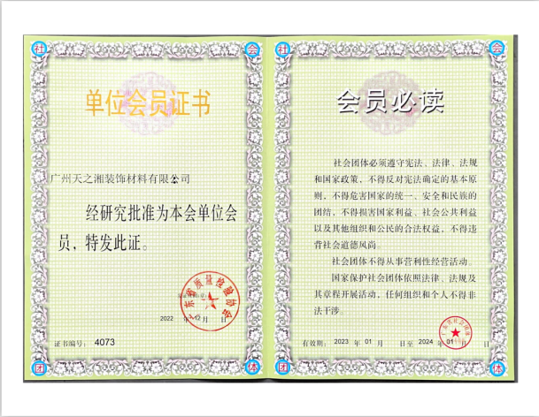 为更好专注产品研发生产,实现品牌的破局迎新,树立领军企业行业标杆。辞旧迎新之际,广州天之湘装饰材料有限公司加入广东省质量检验协会团体,为建材行业质量检验事业献计献策,共创未来。