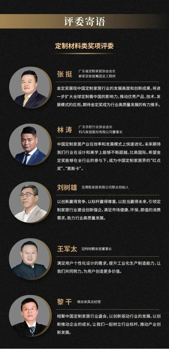 金定奖的评委来自行业专家、定制家居企业高管、知名设计师、行业资深媒体人等。他们将以多元化、专业化、系统化的视角和经验,从产品创新性、环保性、功能性、技术性、美学、商业性等多维度进行公平、公开、公正评审,评选出年度行业创新榜样,激励定制家居产业高质量发展。