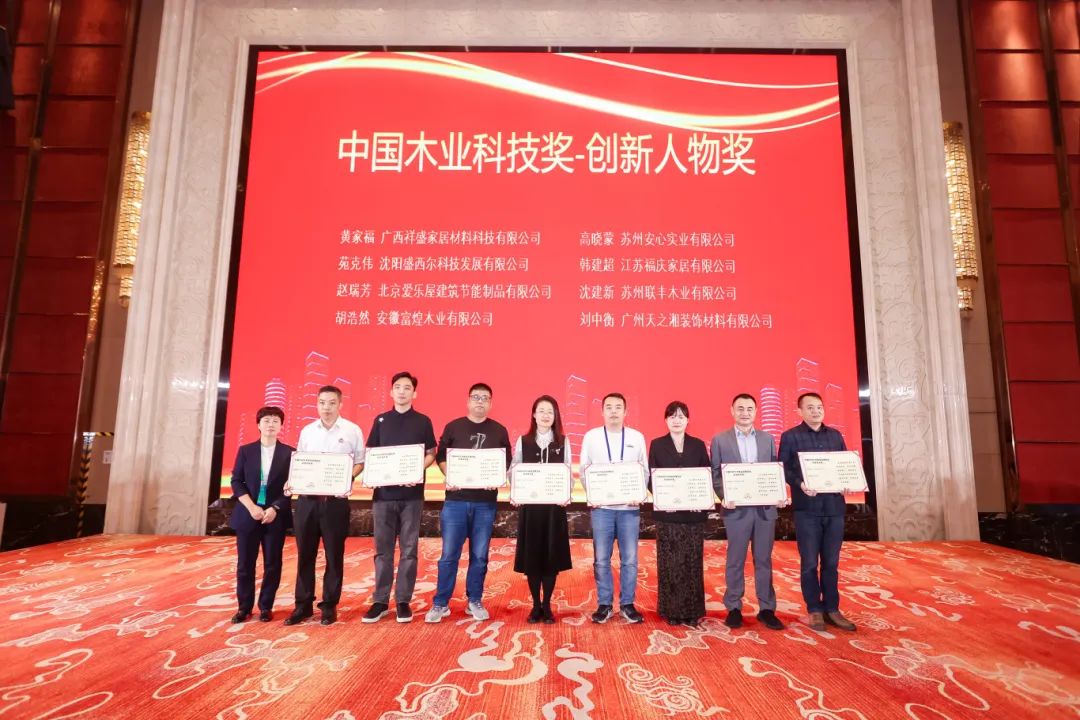 与此同时,天湘原晶建材负责人刘中衡也凭借其在推动企业技术创新进程中的卓越领导力与突出贡献,荣获中国木业科技奖 - 创新人物奖。他在领奖台上的风采,彰显了天湘板业背后强大的科研创新团队力量与追求卓越的企业精神。