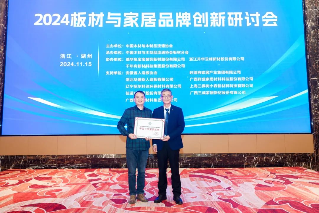 在推动板材与家居品牌迈向国际化的浪潮中,天湘板业积极参与了一场意义非凡的行业盛会 ——“2024 板材与家居品牌创新研讨会”。此次研讨会于11月15日在浙江湖州盛大召开,由中国木材与木制品流通协会主办,天湘板业董事长刘承恒与天湘原晶建材负责人刘中衡应邀出席此次会议,同时汇聚了众多行业精英,共同探讨板材与家居品牌发展的新路径。